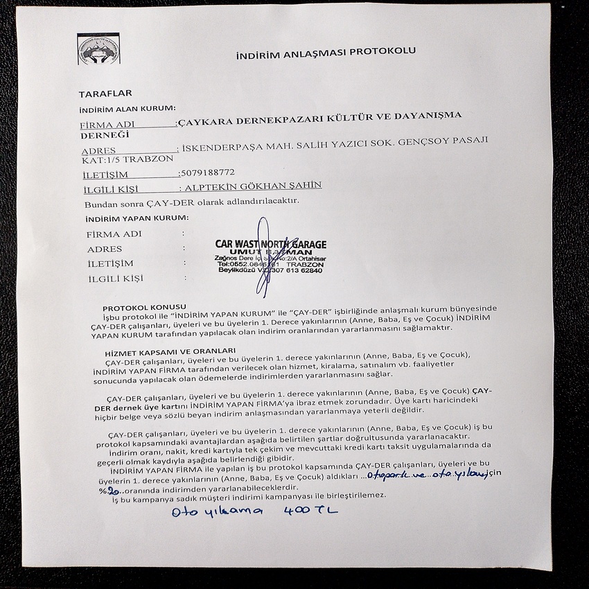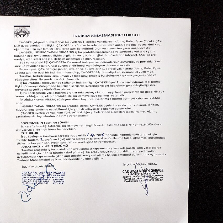 Çaykara Dernekpazarı Kültür ve Dayanışma Derneği olarak, üyelerimize yönelik sosyal ve ekonomik avantajlar sunmaya devam ediyoruz. Bu kapsamda, oto yıkama ve otopark hizmeti sunan CAR WASH NORTH GARAGE firması ile indirim anlaşması gerçekleştirdik.