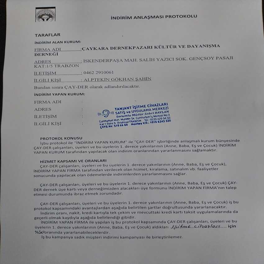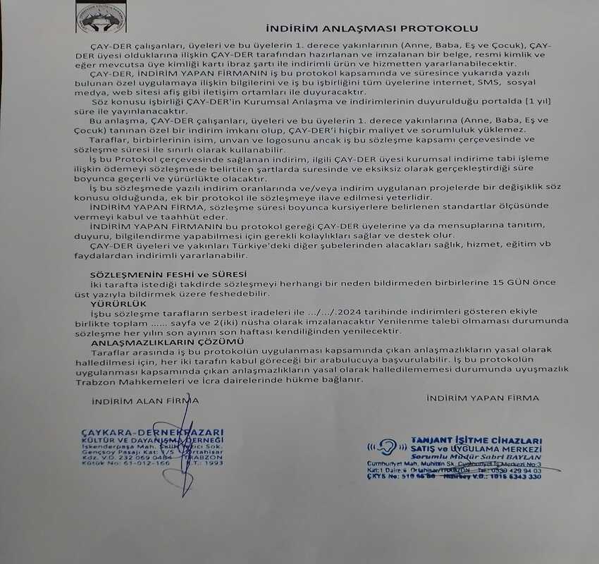 Çaykara Dernekpazarı Kültür ve Dayanışma Derneği (ÇAY-DER) ve Tanjant İşitme Cihazları arasında gerçekleşen iş birliği anlaşması, ÇAY-DER üyeleri ve aileleri için avantajlı fırsatları beraberinde getiriyor. Bu anlaşma kapsamında, Tanjant İşitme Cihazları tarafından sunulan İşitme cihazı satışı, yedek parça temini, işitme ve işitme cihazı teknik servis hizmetlerinden ÇAY-DER üyeleri %30 indirim ile faydalanacaklar. Ayrıca, bu hizmetleri kullanmak isteyen üyelere, kredi kartına özel taksit imkanı sunulmaktadır.