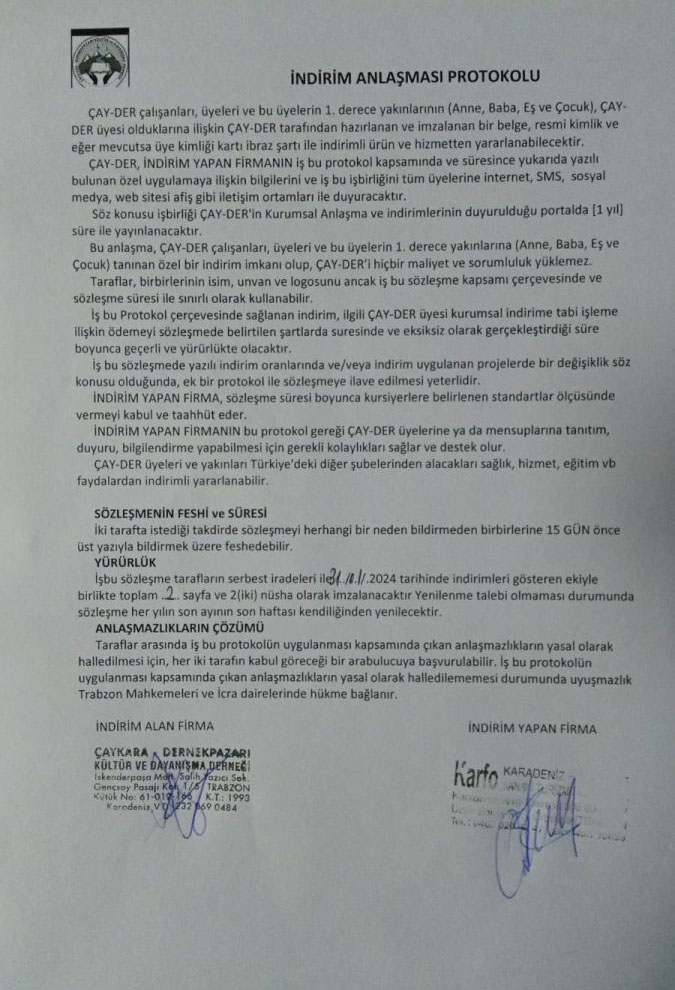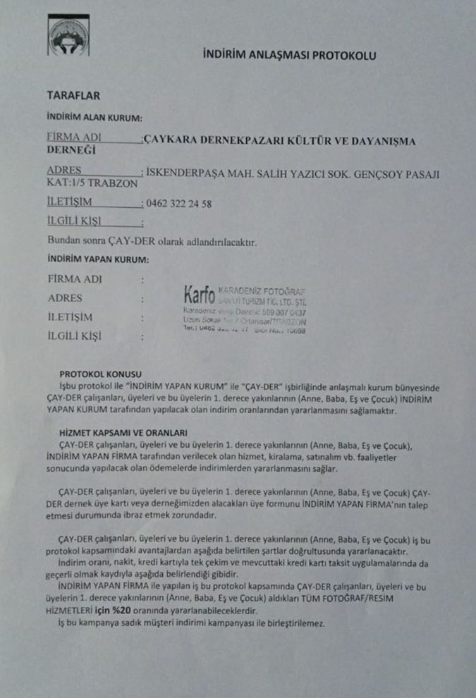 Derneğimizin üyelerimize yönelik çalışmalarından bir tanesi olan indirim anlaşmaları kapsamında Çaykaranın eskimeyen fotoğrafçılarından Ferhat YILDIZ'ın sahip olduğu KARFO KARADENİZ FOTOĞRAFÇILIK ile indirim anlaşması imzalandı.