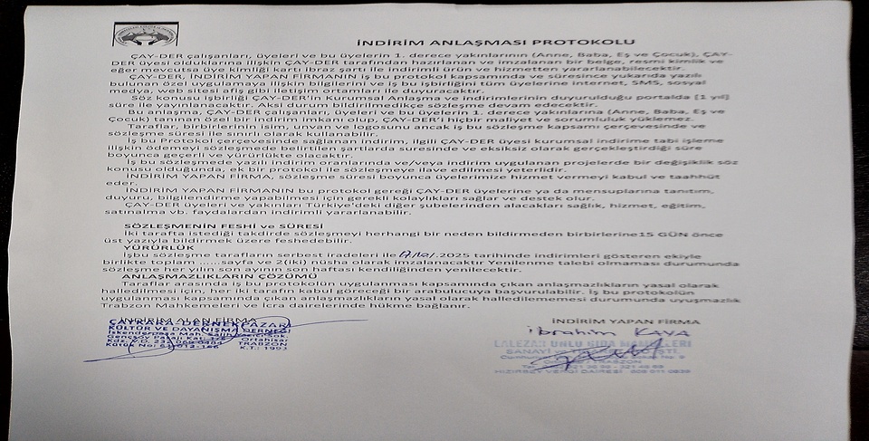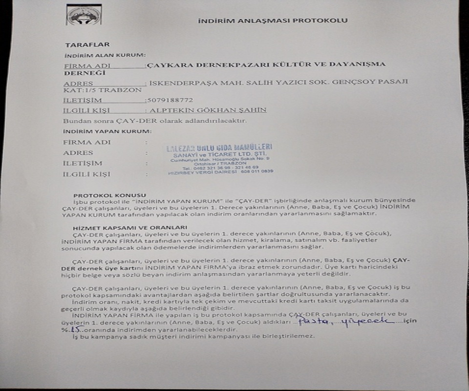 Trabzon etkin bir müşteri potansiyeline sahip olan hemşerimiz İbrahim KAYA, derneğimizin sosyal faaliyetlerinden olan indirim anlaşmalarına destek oldu.
