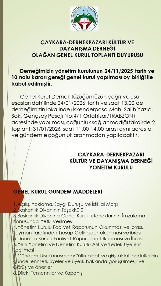 Genel Kurul Dernek tüzüğümüzün çağrı ve usul esasları dahilinde 24/01/2026 tarih ve saat 13.00 de derneğimizin lokalinde (İskenderpaşa Mah. Salih Yazıcı Sok. Gençsoy Pasajı No:4/1 Ortahisar/TRABZON) adresinde yapılması, çoğunluk sağlanmadığı takdirde 2. toplantı 31/01/2026 saat 11.00-14.00 arası aynı adreste ve gündemle çoğunluk aranmadan yapılacaktır.